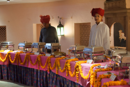The evening starts with a traditional welcome with camels (guests can have a ride should they wish) before being adorned with a flower garland and decorated with a tika. Food is freshly-cooked in-house and presented as a multi-cuisine buffet where guests can feast on different cuisines, such as Indian, Chinese, and Continental. Drinks are on a chargeable basis.