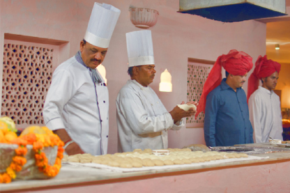 The evening starts with a traditional welcome with camels (guests can have a ride should they wish) before being adorned with a flower garland and decorated with a tika. Food is freshly-cooked in-house and presented as a multi-cuisine buffet where guests can feast on different cuisines, such as Indian, Chinese, and Continental. Drinks are on a chargeable basis.